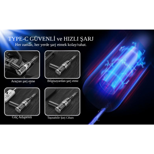 Cevap 2: Süpürgeniz, modern Type-C girişi ile 3 saat içinde tamamen şarj olur; araç şarj cihazı, Power Bank veya bilgisayardan da şarj edebilirsiniz.